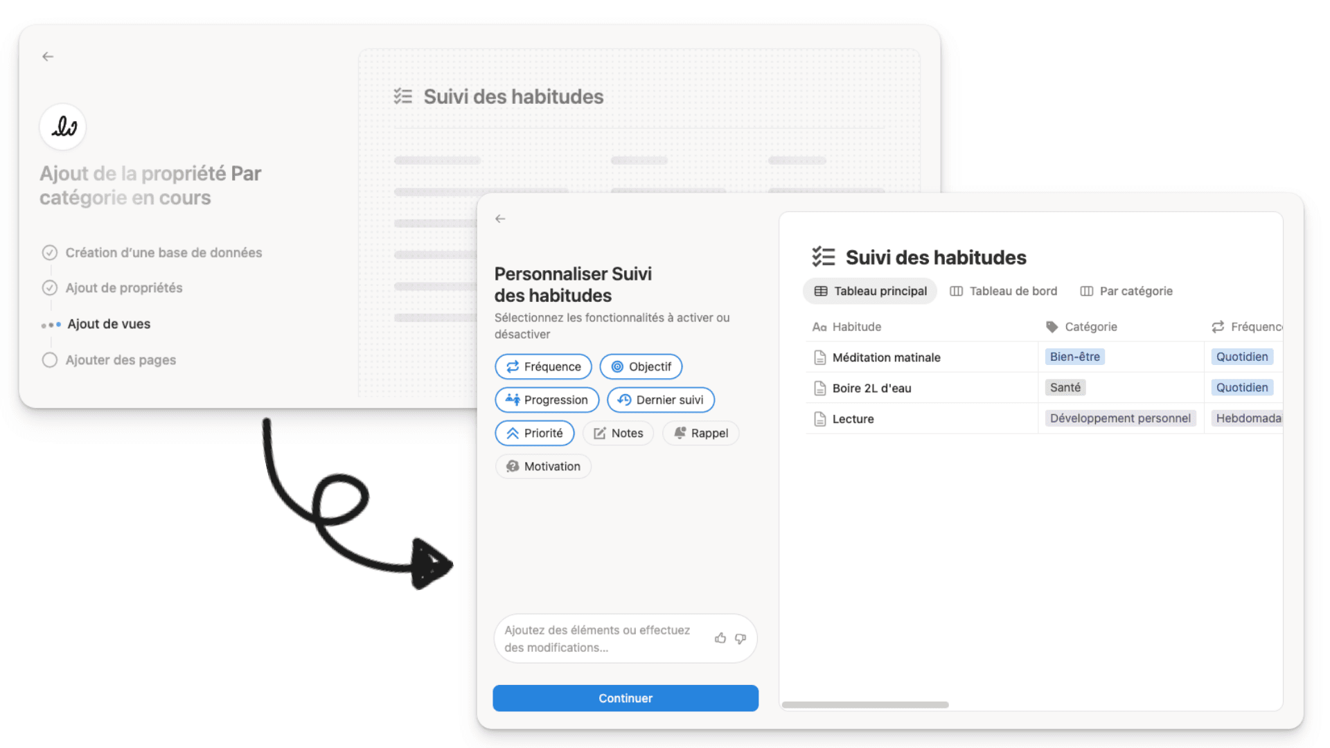 Notes de réunion intelligentes, agents IA connectés à vos outils, création automatique de base de données…