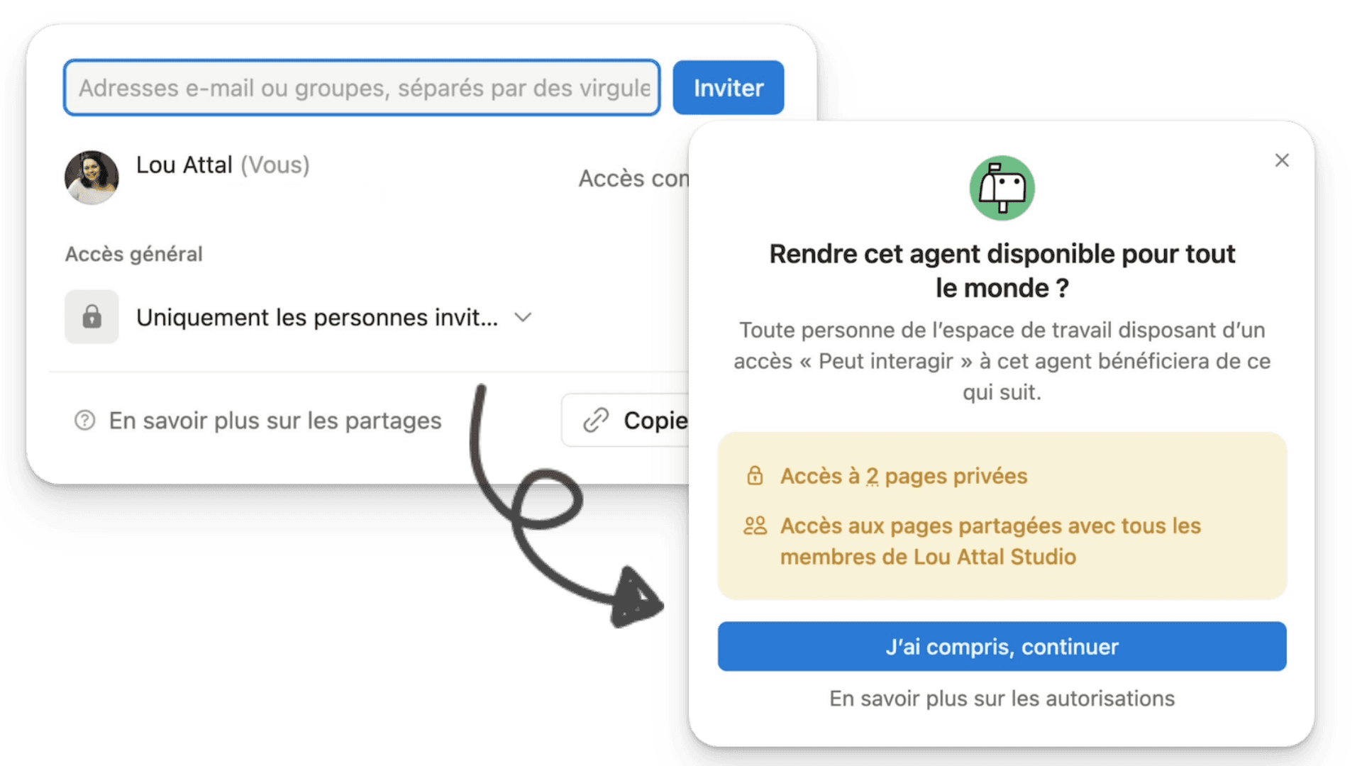 Ajustez les permissions et les accès aux pages ou bases que l’agent doit pouvoir lire ou modifier.