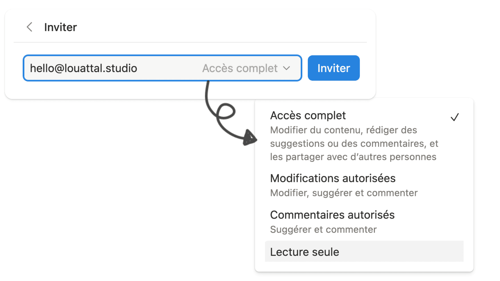 Notion permet également de partager facilement des pages et de gérer précisément les accès : lecture, commentaires ou modification. Vous pouvez ainsi collaborer efficacement avec une équipe ou des clients, tout en gardant le contrôle sur ce que chacun peut voir ou modifier !