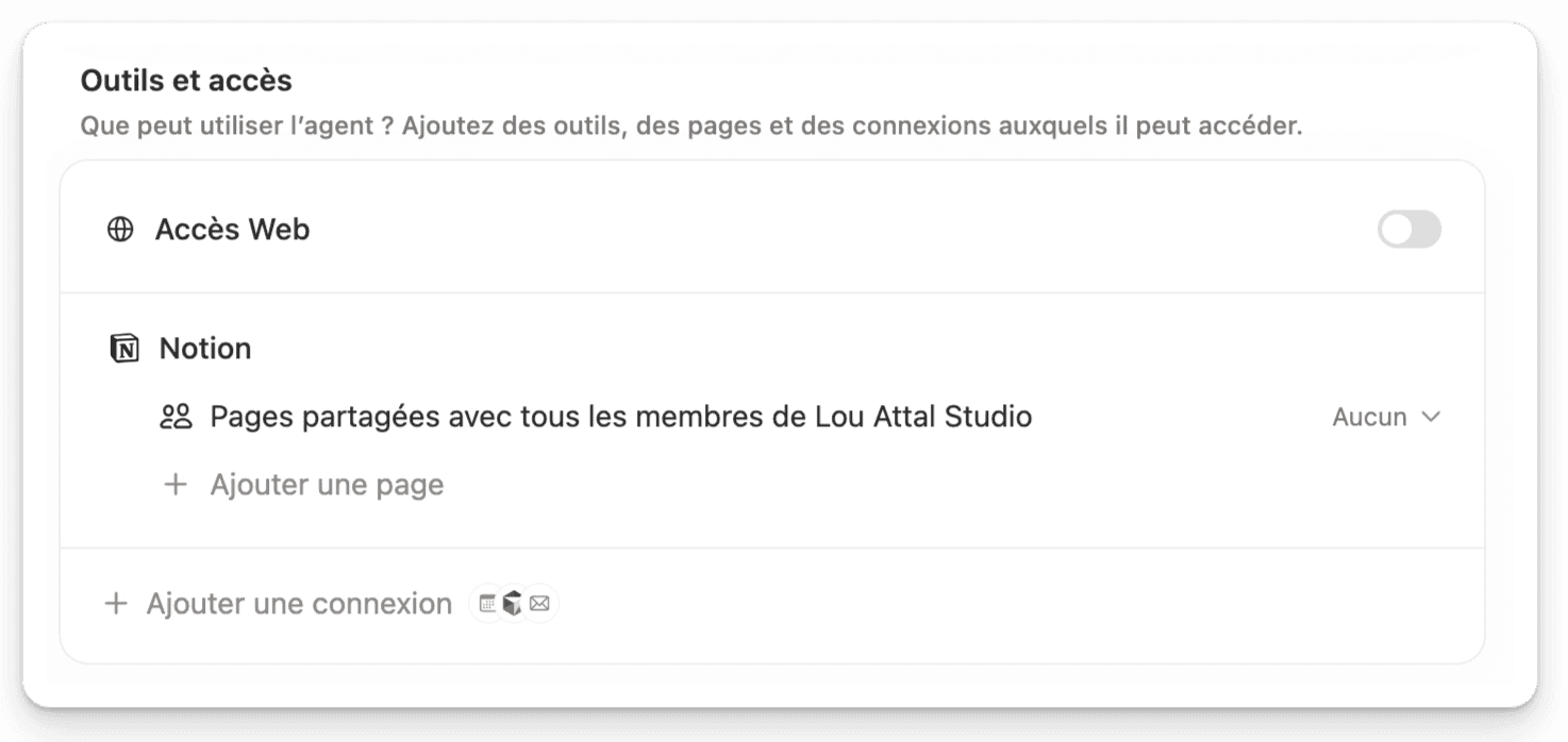 Les agents peuvent également se connecter à d’autres outils comme Slack, votre boite mail ou votre calendrier. Cela leur permet d’interagir avec votre environnement de travail au-delà de Notion.