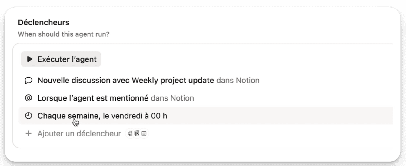 ⚙️ Vous configurez des déclencheurs (exemple : à une certaine heure, ou lorsqu'une propriété change dans une base de données)