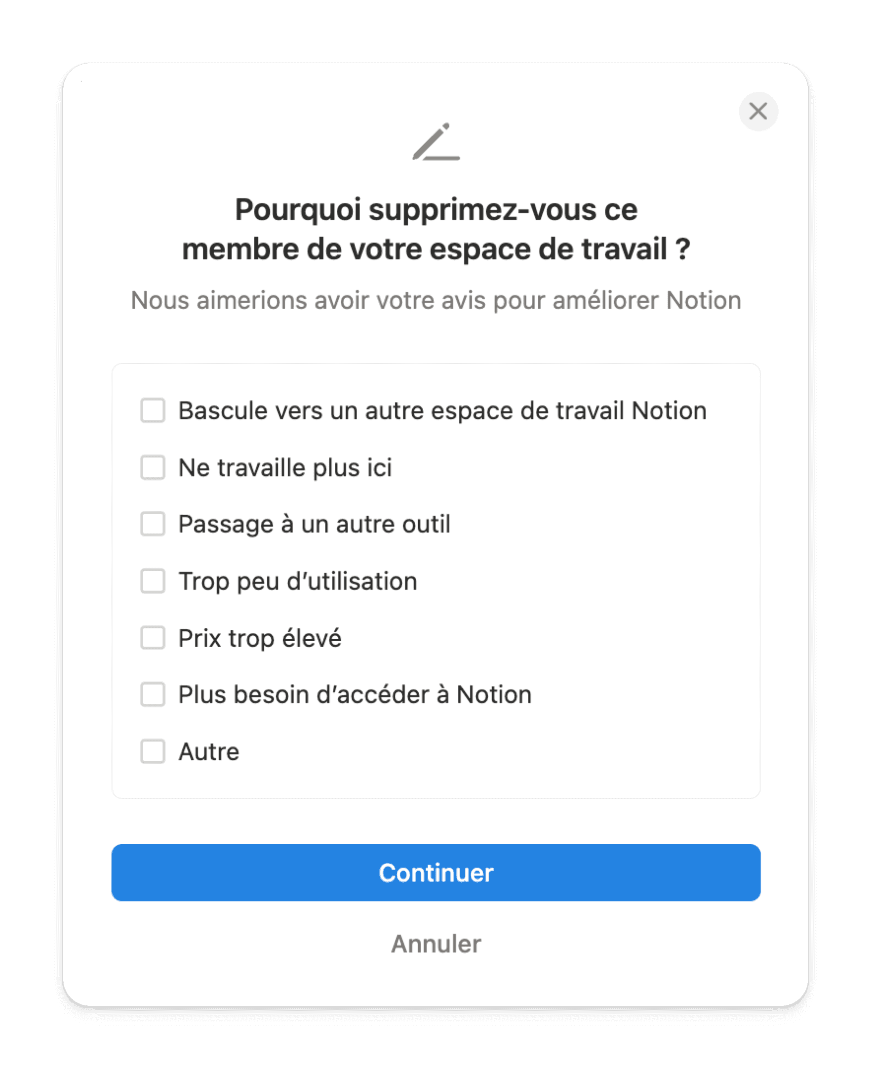 Si votre espace est sur un plan payant : Retirer un membre libère instantanément un siège. Ce siège reste disponible jusqu'au prochain cycle de facturation. Si vous n'ajoutez personne d'ici là, Notion le supprimera automatiquement de votre facture lors du renouvellement.
