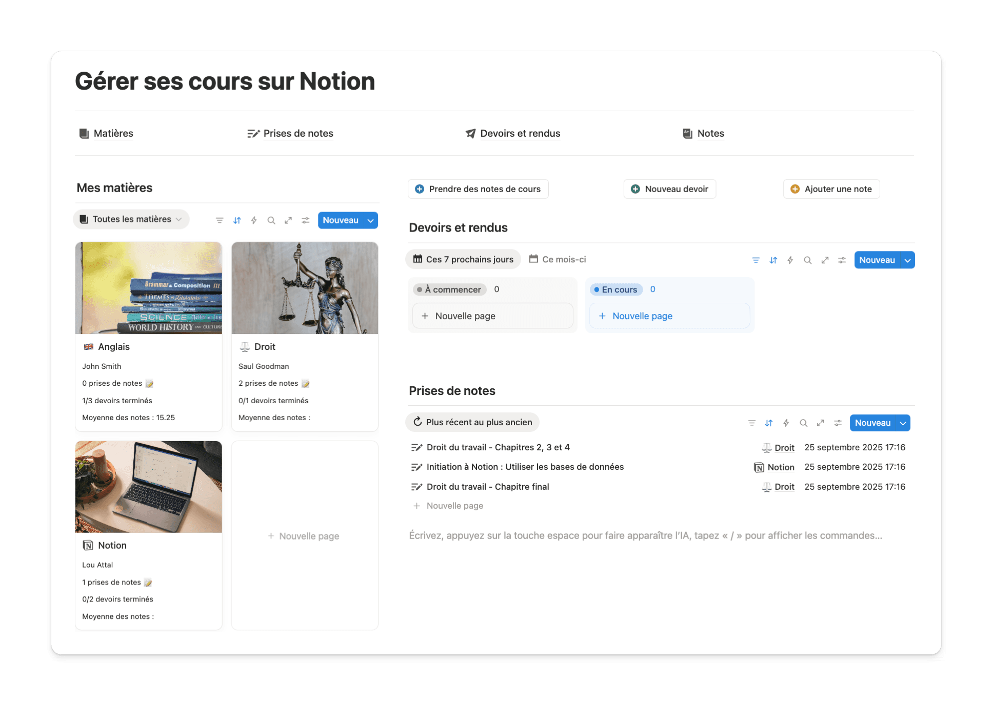 Pour aller plus loin, vous pouvez utiliser le modèle de gestion des cours, pensé spécialement pour organiser ses matières et ses rendus → https://affiliate.notion.so/etudes