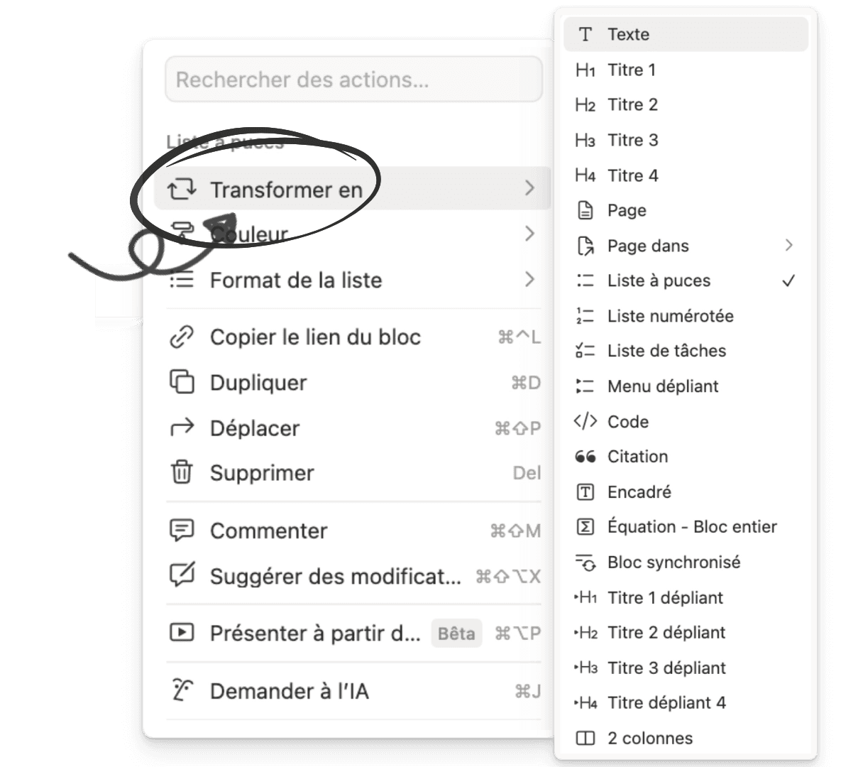 La fonction “Transformer en” permet de passer d’une liste à puces à une liste numérotée ou bien de transformer un texte en titre, cela permet d’obtenir un vrai gain de temps pour structurer vos notes.