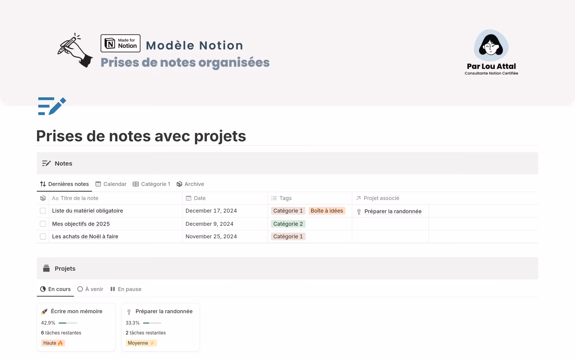 Une base de données seule ne suffit pas. Ce sont les vues qui rendent le système vraiment efficace. Par exemple une vue “dernières notes”, une vue “calendrier” ou une vue “archives”. L’idée est de filtrer intelligemment pour accéder rapidement à l’information dont vous avez besoin.