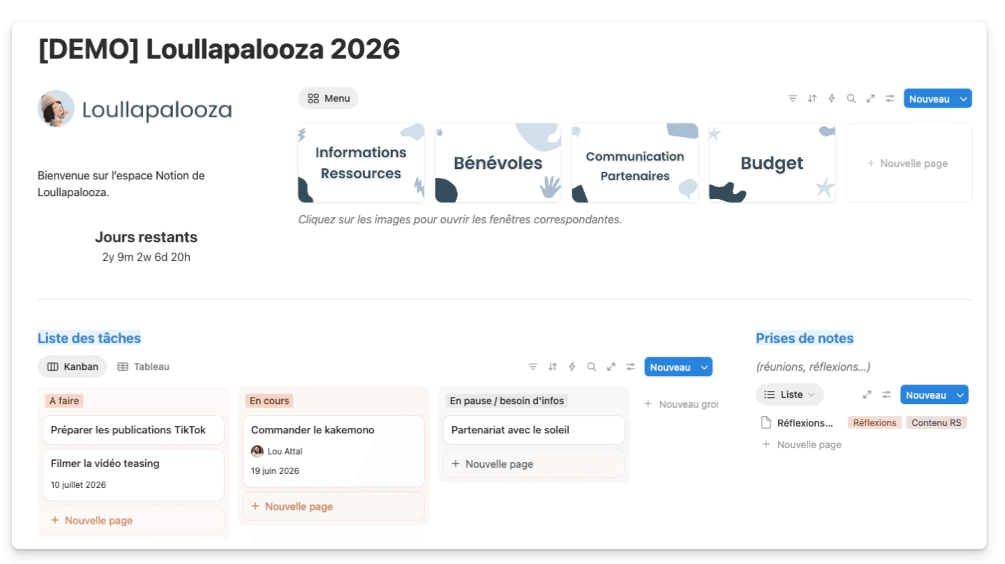 Notion remplace souvent plusieurs outils tels que Google Docs, Trello, Drive, etc. Il s’adapte aussi bien à un petit collectif qu’à une association structurée avec plusieurs pôles.