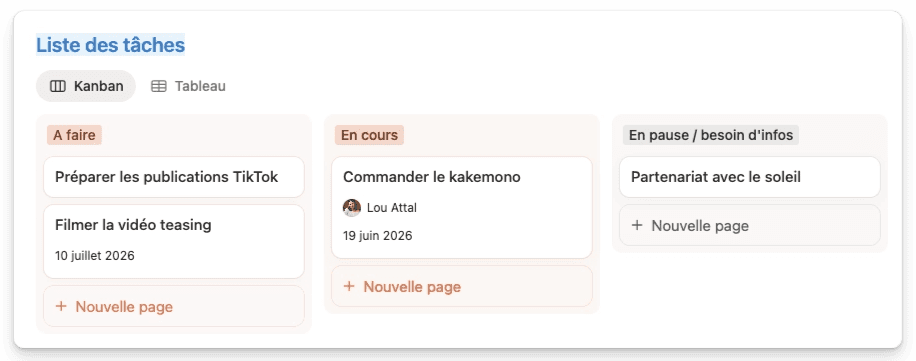 Avec des vues type Kanban, calendrier ou timeline, vous avez une vision claire de l’avancement. Notion permet de structurer :